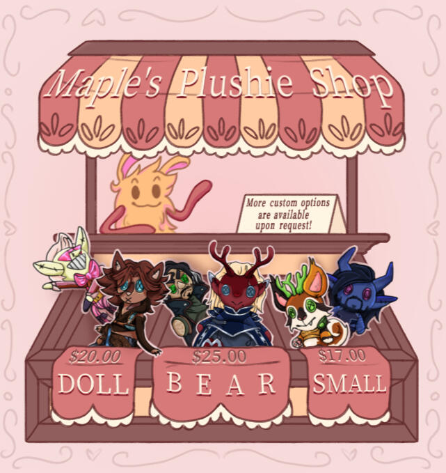 Both Standard Commission Examples and Drawn Plush Examples can be found in my Portfolio and upon request