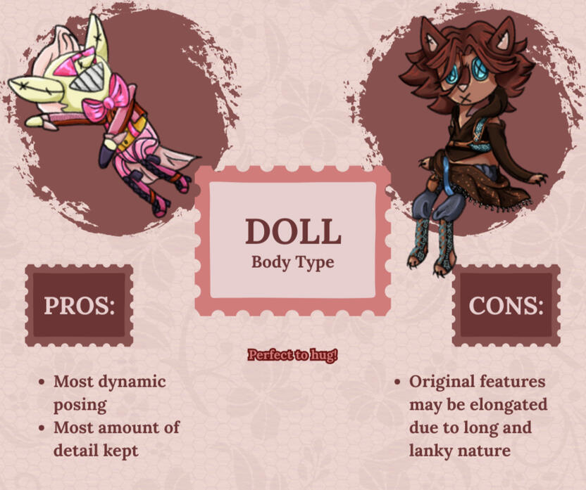 | Doll | $20.00 | Long lanky & most dynamic in posing. Most detail possible, least amount of design simplification. |
