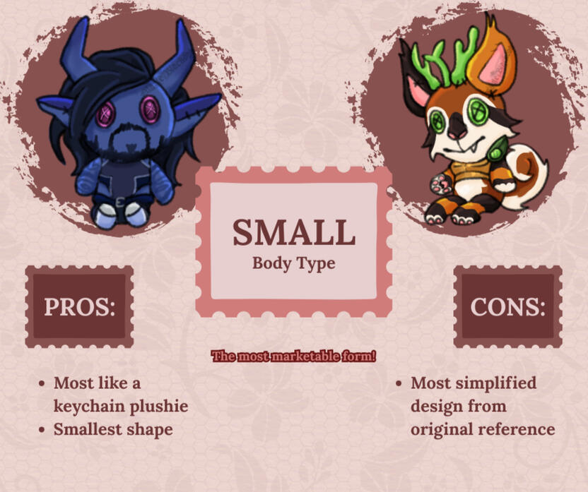 | Small | $17.00 | Most alike to keychain plushies, the most "chibi" out of all options. All design details will likely be simplified. |